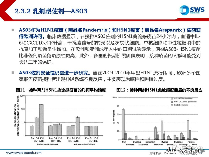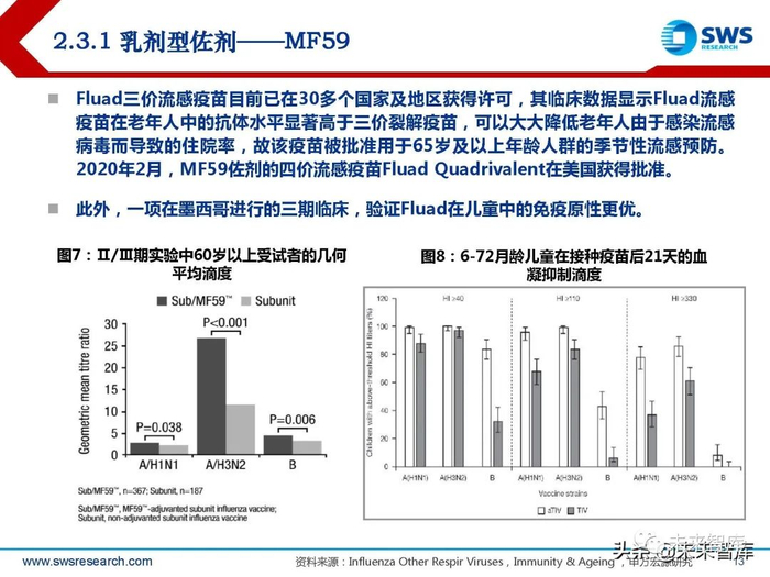 MF59佐剂可诱导产生比铝佐剂更强的体液免疫反应。流感疫苗的动物实验结果显示, MF59佐剂的流感疫苗诱导的抗体免疫反应比铝佐剂高100倍,同时也能诱导产生一定 的Th1型细胞免疫反应。对MF59及其疫苗进行的GLP毒理学研究表明,MF59及其疫苗 没有潜在的系统毒性。