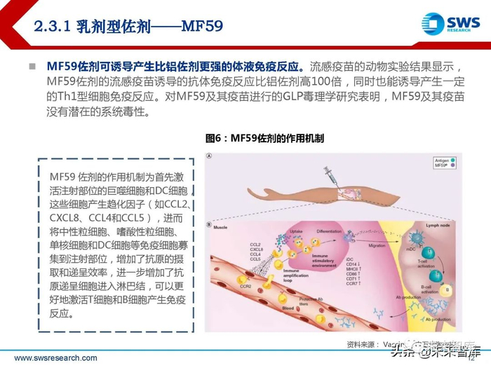 MF59 佐剂的作用机制为首先激 活注射部位的巨噬细胞和DC细胞, 这些细胞产生趋化因子(如CCL2、 CXCL8、CCL4和CCL5),进而 将中性粒细胞、嗜酸性粒细胞、 单核细胞和DC细胞等免疫细胞募 集到注射部位,增加了抗原的摄 取和递呈效率,进一步增加了抗 原递呈细胞进入淋巴结,可以更 好地激活T细胞和B细胞产生免疫 反应。