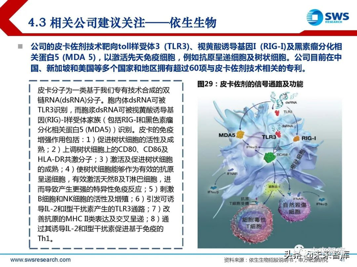 皮卡分子为一类基于我们专有技术合成的双 链RNA(dsRNA)分子。胞內体dsRNA可被 TLR3识别,而胞浆dsRNA可被视黄酸诱导基 因(RIG)-I样受体家族(包括RIG-I和黑色素瘤 分化相关蛋白5 (MDA5))识别。皮卡的免疫 增强作用包括:1)促进树状细胞的活性及成 熟;2)上调树状细胞上的CD80、CD86及 HLA-DR共激分子;3)激活及促进树状细胞 的成熟;4)使树状细胞能够作为有效的抗原 呈递细胞,有效激活天然B及T淋巴细胞,进 而导致产生更强的特异性免疫反应;5)刺激 B细胞和NK细胞的活性及增殖;6)引发可诱 导IL-2和I型干扰素产生的TLR3通路;7)改 善抗原的MHC II类表达及交叉呈递;8)通 过其诱导IL-2和I型干扰素促进基于免疫的 Th1。