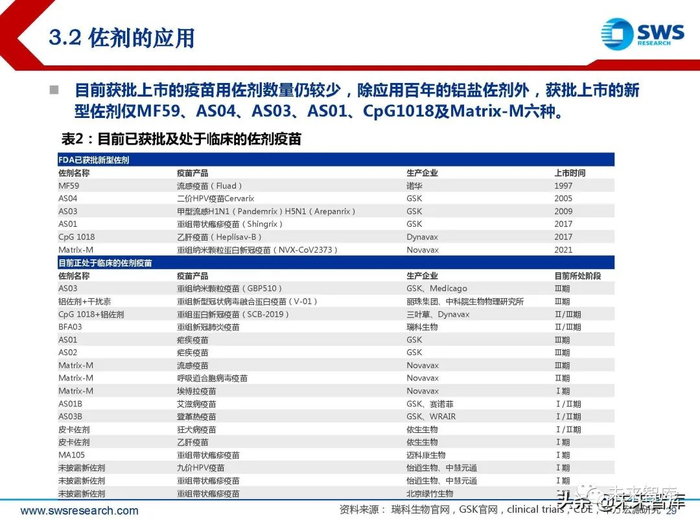 目前获批上市的疫苗用佐剂数量仍较少,除应用百年的铝盐佐剂外,获批上市的新 型佐剂仅MF59、AS04、AS03、AS01、CpG1018及Matrix-M六种。