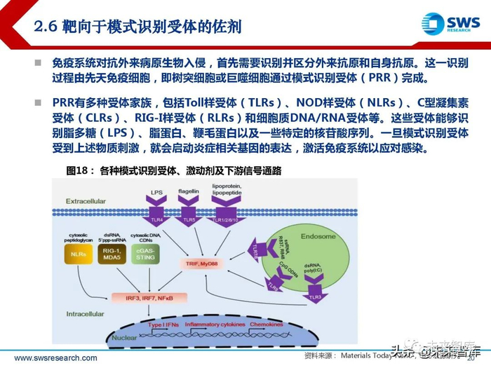 免疫系统对抗外来病原生物入侵,首先需要识别并区分外来抗原和自身抗原。这一识别 过程由先天免疫细胞,即树突细胞或巨噬细胞通过模式识别受体(PRR)完成。PRR有多种受体家族,包括Toll样受体(TLRs)、NOD样受体(NLRs)、C型凝集素 受体(CLRs)、RIG-I样受体(RLRs)和细胞质DNA/RNA受体等。这些受体能够识 别脂多糖(LPS)、脂蛋白、鞭毛蛋白以及一些特定的核苷酸序列。一旦模式识别受体 受到上述物质刺激,就会启动炎症相关基因的表达,激活免疫系统以应对感染。