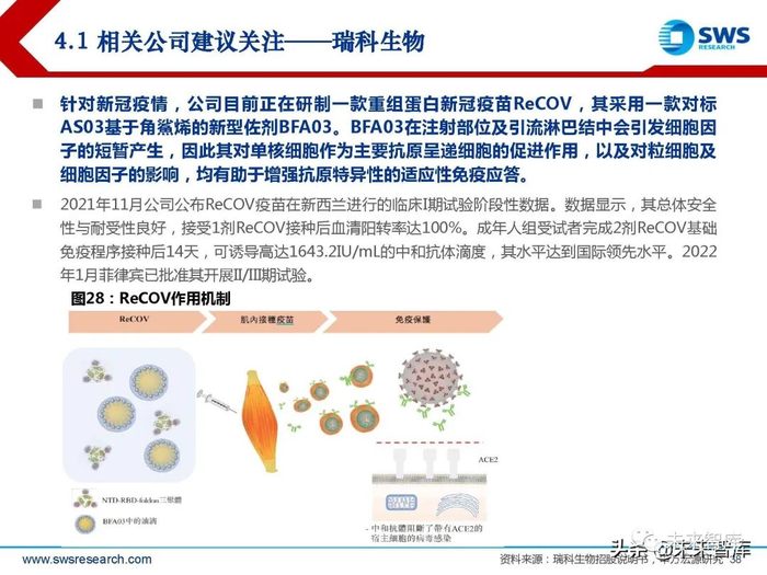 针对新冠疫情,公司目前正在研制一款重组蛋白新冠疫苗ReCOV,其采用一款对标 AS03基于角鯊烯的新型佐剂BFA03。BFA03在注射部位及引流淋巴结中会引发细胞因 子的短暂产生,因此其对单核细胞作为主要抗原呈递细胞的促进作用,以及对粒细胞及 细胞因子的影响,均有助于增强抗原特异性的适应性免疫应答。2021年11月公司公布ReCOV疫苗在新西兰进行的临床I期试验阶段性数据。数据显示,其总体安全 性与耐受性良好,接受1剂ReCOV接种后血清阳转率达100%。成年人组受试者完成2剂ReCOV基础 免疫程序接种后14天,可诱导高达1643.2IU/mL的中和抗体滴度,其水平达到国际领先水平。2022 年1月菲律宾已批准其开展II/III期试验。(报告来源:未来智库)