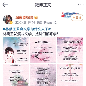 “横竖就拿那么一点工资,还要24小时使唤人了”,“你瞧,又开始画饼了,我要是信了,怕是要哭断肠去了”……“林黛玉发疯文学”近来走红,截至3月30日下午4时,在微博拥有1.5亿阅读量和1.3万讨论次数;在视频平台,“男版林黛玉发疯文学文案”、“林黛玉发疯语录剪辑”等话题,更是激发了网友们的创作与模仿欲望。