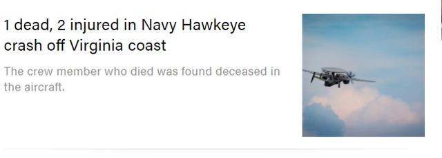 1架美国海军的E-2D 高级鹰眼预警机(Advanced Hawkeye)在弗吉尼亚州海岸坠毁,造成1名机组人员死亡,另外两人受伤。