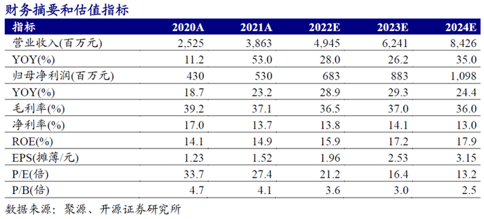 公司发布2021年年度报告,2021 年实现营收38.6亿元,增长53.0%;净利润5.3亿元,增长23.2%;扣非净利润5.1亿元,增长36.6%。2021Q4公司实现收入12亿元,同比增长52.2%;净利润1.6亿元,同比增长54.1%,高增长态势延续。考虑到公司各业务订单增长迅速,我们调高2022-2023年盈利预测并新增2024年盈利预测,预计2022-2024年归母净利润分别为6.83(+6.2%)、8.83(+11.5%)和10.98亿元,2022-2024年EPS分别为1.96(+5.9%)/2.53(+11.5%)/3.15元/股,当前股价对应PE分别为21.2/16.4/13.2倍,维持“买入”评级。