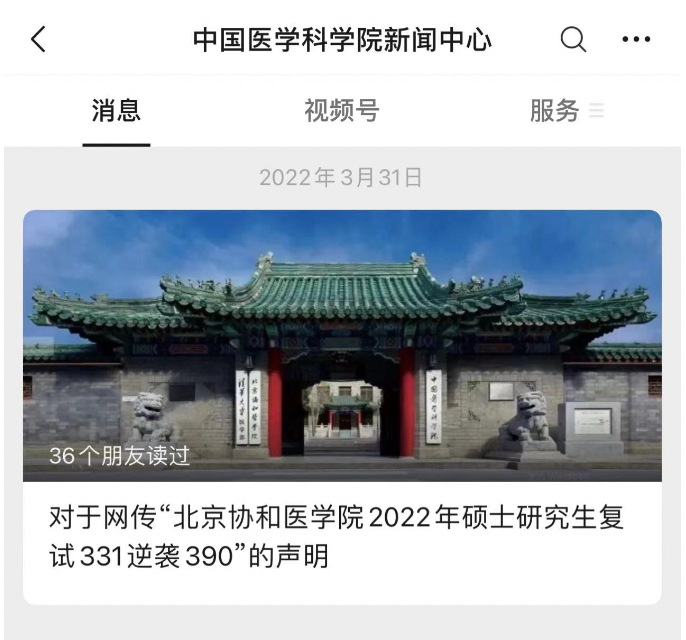 针对网传“北京协和医学院2022年硕士研究生复试331逆袭390”相关言论,3月31日晚间,北京协和医学院研究生院发布声明 :
