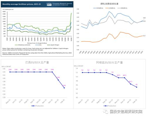 俄乌战争推高国际化肥价格,由于玉米种植成本中化肥所占比重为37%左右,大豆为17%,小麦为35%,国际化肥价格高升,有利于农民增加大豆种植,减少玉米种植。俄乌战争背景下,美国谷物价格同样大幅上涨,有利于弥补玉米种植成本上升,维持玉米净利润。另外,南美21/22季大豆再拉尼娜的影响下大幅减产,造成了南美大豆产量下调。旧作大豆库存不断下调,也会刺激美国农民种植大豆意愿。