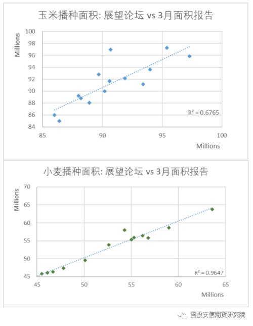 美国农业部往年2月份的展望数据,对于美国农业部3月份的种植意向报告,同样显示出较高的相关性。