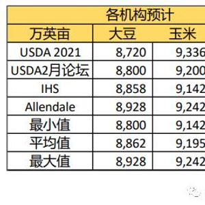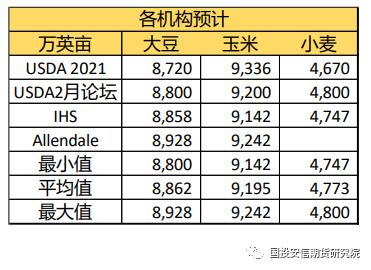 目前,市场对于种植意向报告的预计汇总如下。美国农业部2月展望论坛预计大豆种植面积8800万英亩,玉米种植面积9200万英亩,小麦种植面积4800万英亩。HIS预计为大豆8858万英亩,玉米9142万英亩,小麦4747万英亩,和美国农业部2月展望论坛预计相差不多。美国当地机构Allendale种植面积预计为市场最高值,大豆8929万英亩,玉米9242万英亩。