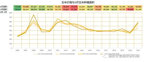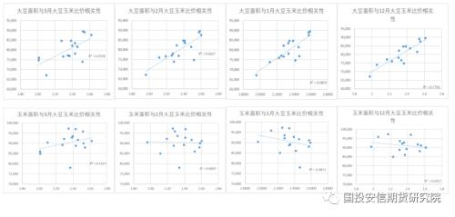 针对分析不同的月份大豆玉米比价和3月面积种植报告的相关关系,可以得出结论3月大豆种植面积报告与大豆玉米比价相关性较强,玉米种植面积与大豆玉米比价相关性较弱。其中,大豆与12月,1月以及2月大豆玉米比价相关性较好。其相关系数分别为0.7756,0.6803和0.6627。玉米种植面积与不同月份大豆玉米比价相关系数最高仅为0.1117。