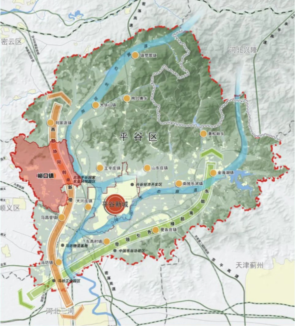 峪口镇位于平谷区西部,临近顺义、地处浅山,生态风貌良好,林田资源优越,农业基础扎实,是平谷区西部协同创新带上的特色小城镇。镇域总面积约64平方公里,下辖20个行政村。