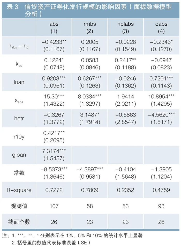 模型四:在其他ABS发行规模的驱动因素中,成本因素影响显著,且与RMBS互呈“挤出效应”。与模型二、模型三相比,在模型四中,成本因素影响显著,房地产贷款集中度的影响显著为负。也就是说,房地产贷款集中度越高的银行,越会将更多的ABS发行额度投向RMBS,而较少投入到其他ABS,这就有了明显的“挤出效应”(见表3)。
