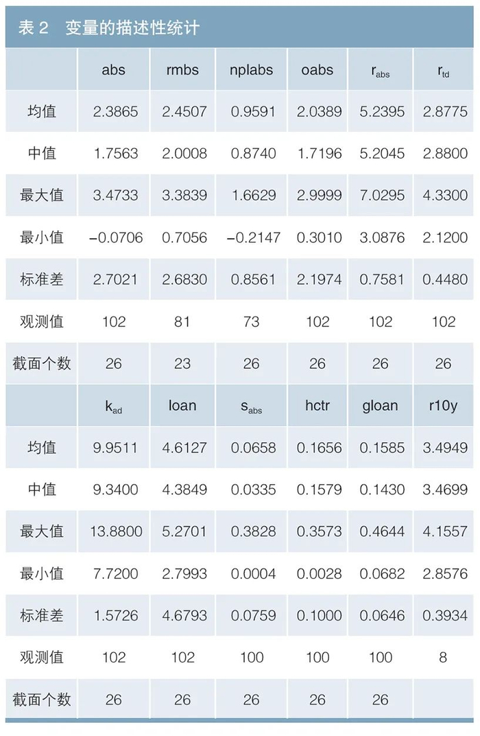 其中,Yit是被解释变量,在四个计量模型中分别以absit(i行在t期发行的ABS总额,取对数)、rmbsit(i行在t期发行的RMBS总额,取对数)、nplabsit(i行在t期发行的不良贷款abs总额,取对数)和oabsit(i行在t期发行的其他ABS总额,取对数)代替。rabsit是abs的发行成本率,rtdit是i行t期对公定期存款成本率,kadit是核心一级资本充足率,loanit是各行贷款余额的对数值,Sabsit是各行t期abs发行额占当期贷款新增量之比,hctrit是各行个人住房贷款集中度,gloanit是贷款增速,r10yt是代表市场利率的10年期国债利率。各变量的描述性统计如表2所示。