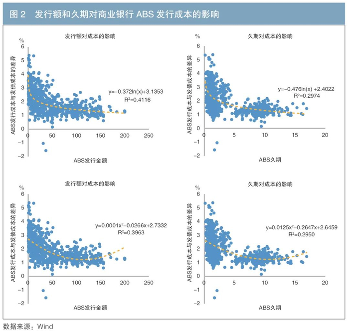 商业银行可以通过调整ABS的发行规模和久期来优化成本。从上述845只商业银行ABS统计数据看,在发行量小、久期短时,发行成本率2随发行量增大和久期拉长而迅速下降;但在发行量超过100亿元以及久期超过5年后,发行成本会趋于稳定。在图2中,本文分别构建了两组模型:其中左上图和右上图是对数函数模型;左下图和右下图是二次函数模型。计量分析表明,在发行量和成本的关系方面(左上图和左下图),对数函数模型的拟合优度高于二次函数模型;在久期和成本的关系方面(左上图和左下图),两个模型的拟合优度相近(见图2)。从统计分析的角度看,发行量存在最优值的概率较低,而久期存在最优值的概率较高。用二次函数模型求解最优值可得到,当发行金额为107亿元3时发行成本最低,最佳久期为10.66年4。此结果可作为学术探讨,也可以作为实务操作的参考。