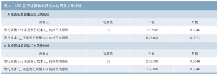 年度数据和月度数据的因果关系相反,揭示了ABS发行量和成本相互作用的不同机理。从年度面板数据看,ABS发行量是发行成本的格兰杰原因,反之则不是。为了对比,本文另外构建了月度面板数据模型,此模型中的发行额和发行成本都按月加总和加权平均。从月度数据看,ABS发行成本是ABS发行量的格兰杰原因,反之则不是。ABS的年度发行成本无法影响ABS的年度发行规模,但是ABS的月度发行成本影响其月度发行规模,即在ABS的年度发行计划确定后,各月的发行规模与成本有很大关系,有明显的“择时”考虑因素(见表4)。