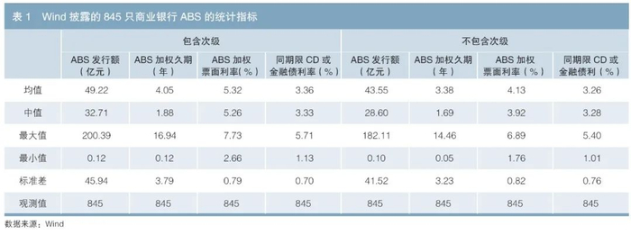 商业银行ABS发行成本总体高于同业存单(CD)和金融债。本文统计了万得(Wind)披露的845只商业银行的ABS产品数据,发行时间为2005年12月至2022年1月,发行银行共有101家。本文对每一只ABS产品分别计算包含次级和不含次级的金额、久期和加权票面利率。假设债券次级档的收益率为8%(根据ABS实务经验值确定)。一般来说,次级资产收益率不足的,发行方会通过超额抵押、封包期利息入池1等方法提升收益率;当次级资产收益率达到约定值时会触发回购条款。本文根据每一只ABS的加权久期,找出与其对应的CD 和金融债的收益率(市场化融资利率)。具体方法是:将101家发行银行按照政策性银行、国有银行、股份制银行、城市商业银行和农村商业银行分成五组,每一组都根据Wind数据构建CD和金融债的收益率曲线。如果相应期限债券的收益率缺失,则采取插值法确定,从而在五组收益率曲线的基础上得到与每只ABS对应的市场化融资利率。上述845只ABS的数据统计信息如表1所示。根据ABS加权票面利率(发行成本)和对应的市场化融资利率,本文通过散点图进行分析。如图1所示,包含次级的ABS发行成本显著高于市场化融资利率,只有两只产品例外;不包含次级的ABS发行成本仍高于市场化融资利率,但是差距有所缩小,而且有27只产品的ABS发行成本更低一些。统计表明,在包含次级的情况下,ABS发行成本与市场化融资利率之差的算术平均值为196BP,经发行额和久期加权的平均值为134BP;在不包含次级的情况下,ABS发行成本与市场化融资利率之差的算术平均值为87BP,经发行额和久期加权的平均值为40BP。