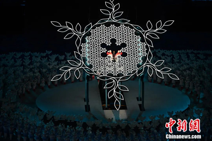 2022年2月4日晚,第二十四届冬季奥林匹克运动会开幕式在北京国家体育场举行。图为最后一棒火炬手迪妮格尔·衣拉木江(左)和赵嘉文将火炬嵌入“大雪花”中央。中新社记者 毛建军 摄
