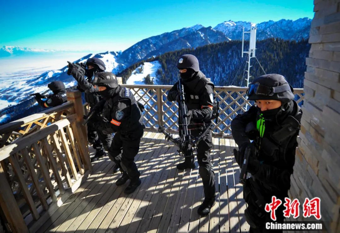 2015年12月15日,新疆乌鲁木齐市公安局特警八支队在进行应急处突演习。图为特警队员在海拔2300米的山顶搜索目标。中新社记者 刘新 摄