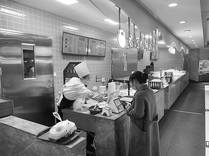 在门头沟熙旺中心香满道美食广场一处销售肉饼和粥的档口,服务员正在紧张地打包,只见她把几个餐盒装满,然后把餐盒放进塑料袋,简单地在塑料袋上打了个结。在她旁边的桌子上,一个放了一份饼和一碗汤的塑料袋甚至连袋口都没有系上,就已经算打包完成了。