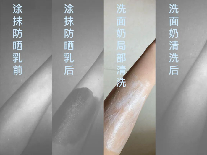 本刊模拟了消费者日常使用防晒乳的情况,基于UV成像设备,我们将洗面奶作用于涂抹了防晒乳的皮肤并进行冲洗,可以看到清洗后手部皮肤几乎没有防晒乳残留。