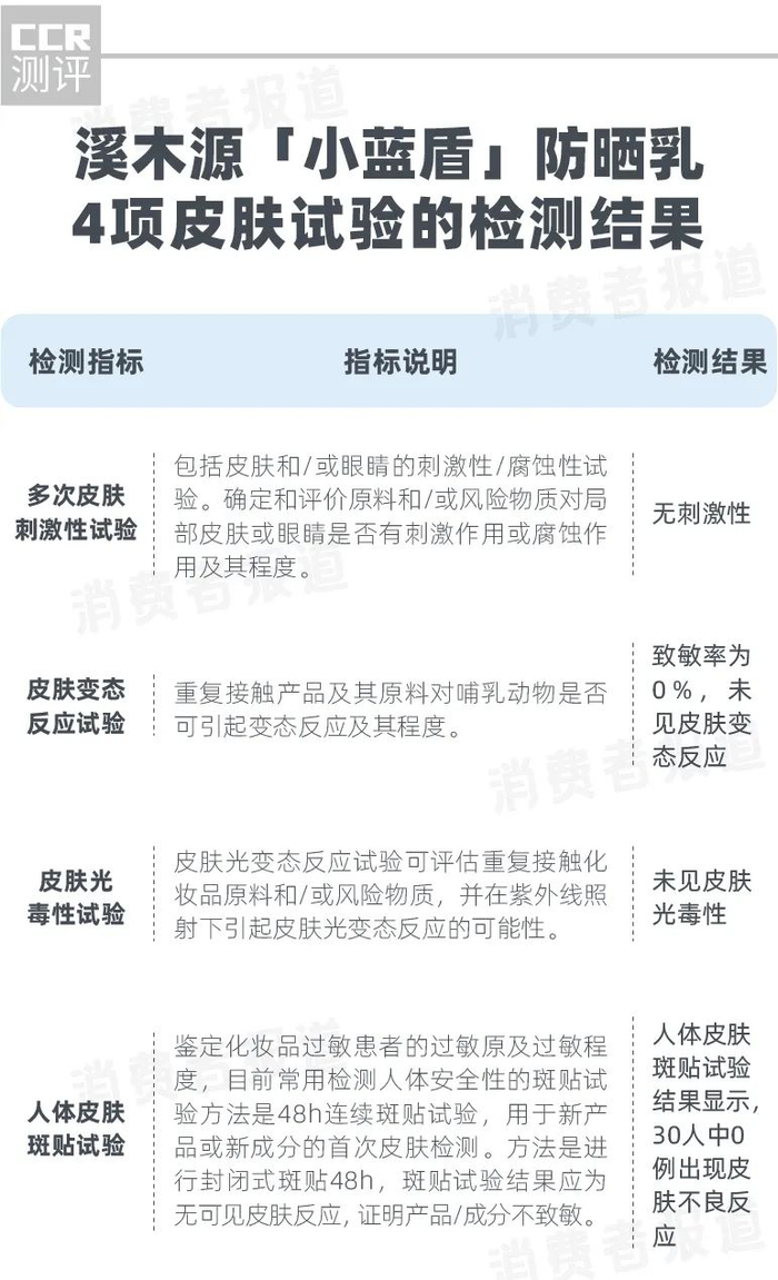 检测结果显示,溪木源「小蓝盾」防晒乳在多次皮肤刺激性试验、皮肤变态反应试验、皮肤光毒性试验中为无刺激性、未见皮肤变态反应、未见皮肤光毒性。而人体皮肤斑贴试验结果显示,30人中0例出现皮肤不良反应。