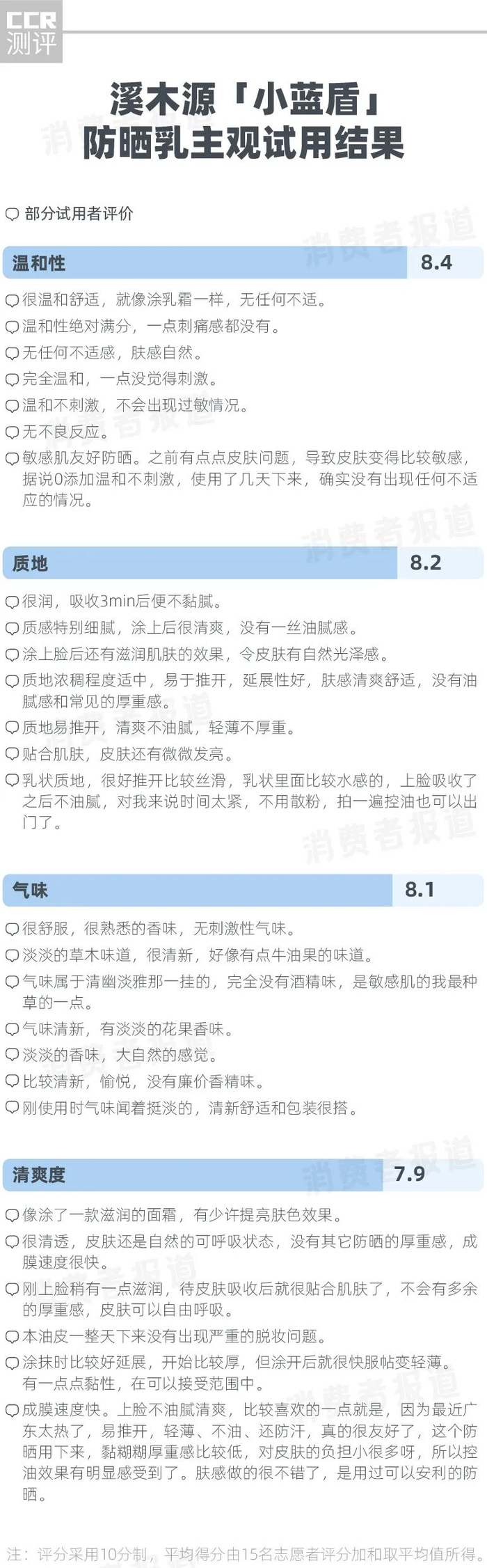 此次,本刊招募了15名平日有使用防晒产品经验的志愿者,试用了该款溪木源「小蓝盾」防晒乳,对其质地、气味、清爽度、温和性作出评分。