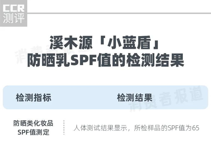 经检测,溪木源「小蓝盾」防晒乳的SPF值为65,代表涂抹后,只有1/65的紫外线会透过防晒乳被皮肤吸收。