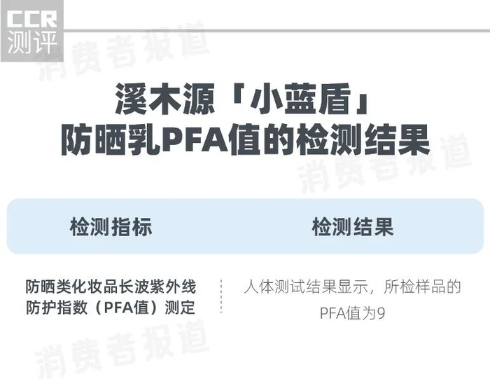 经检测,溪木源「小蓝盾」防晒乳的PFA值为9,对应“PA+++”,表示使用该款防晒乳后理论上可以延长皮肤晒黑时间9倍。