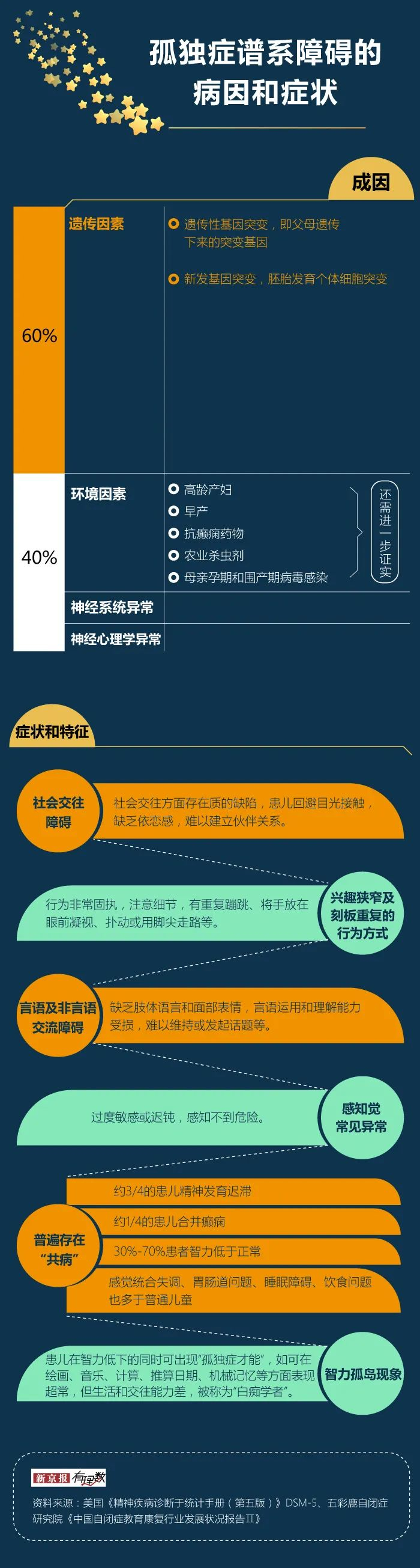 大量研究表明,孤独症谱系障碍的诱因是综合性,并非单一病因造成。虽然具体的其他单一病因没有被完全证实,但可以确定的是,有60%的孤独症跟遗传有关。