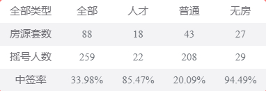 目前项目摇号结果已出炉,88套房源共吸引259组有效报名人数,综合中签率约33.98%。其中人才有效报名人数共22组,无房有效报名人数共29组,普通有效报名人数共208组。