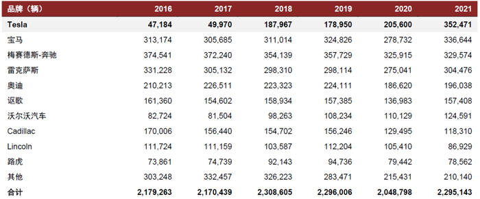 美国豪车市场年销量稳定,特斯拉市占率显著提升。近年美国豪车市场销量稳定,年销约200-230万辆,在整体乘用车销量下滑的背景下,体现了较强的抗压能力。分品牌来看,2018年以来随着Model 3/Y放量,特斯拉在豪车品牌中市占率迅速提升,从2016年的2.2%增长至2021年的15.4%,相应地,其他传统豪华品牌市场份额收到挤压均略有下降。