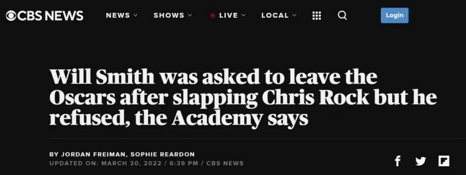 据美国哥伦比亚广播公司(CBS)报道,美国电影艺术与科学学院(奥斯卡金像奖主办单位)当地时间30日在一份声明中表示,威尔·史密斯在抽了克里斯·洛克一耳光后被要求离场,但他拒绝了。声明还表示,已对史密斯违反学院行为准则提起纪律处分。