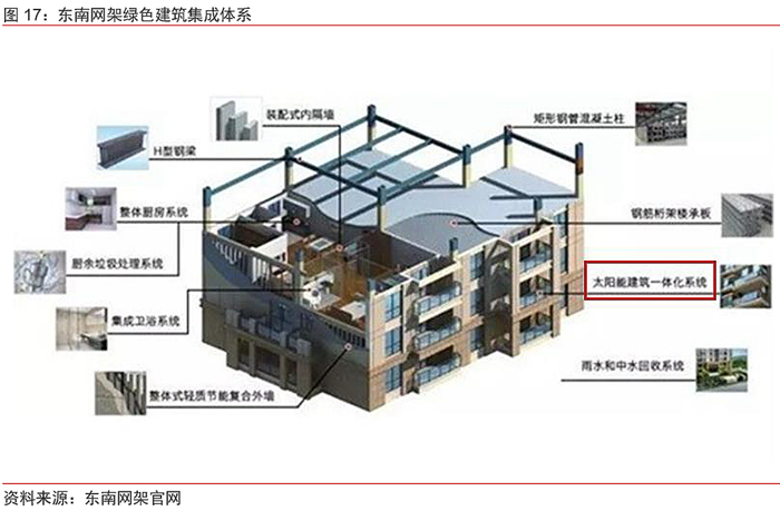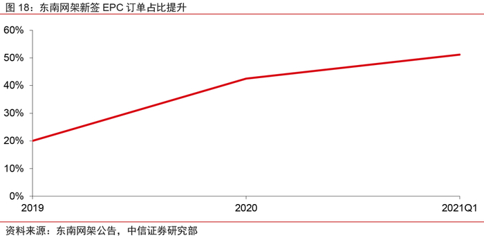 东南网架EPC总包商的新角色利于BIPV的落地推广。在传统建筑工程项目中,钢结构企业以专业分包的形式参建,而金属围护作为轻钢结构的分支,分包规模一般还会小于钢结构。东南网架近两年大步踏上EPC转型之路,新签订单中EPC项目比例显著提高,意味着公司在建筑工程产业链中的位置向上延伸,能够从项目起始便深度介入,统筹负责设计和施工,这对项目早期导入BIPV方案,促进BIPV技术应用推广,真正实现光伏与建筑设计施工一体化都具有积极作用。