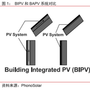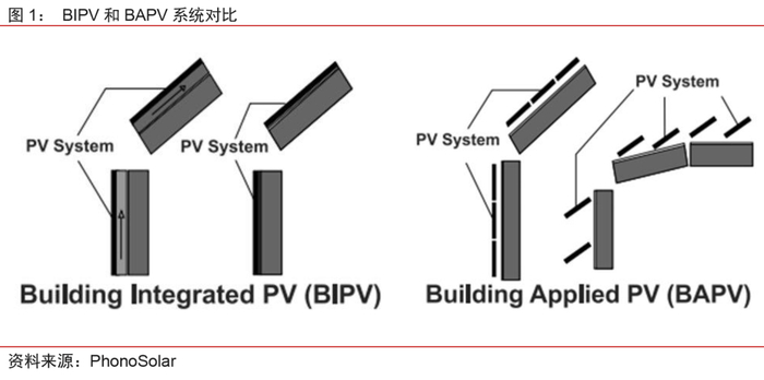 BIPV兼具发电功能和建材属性,强调一体化。光伏建筑一体化(Building Integrated Photovoltaic, BIPV)是分布式光伏发电系统的一种,是将光伏组件集成到建筑上的技术。区别于目前应用较多的安装式光伏发电屋面系统(Building Attached/Applied Photovoltaic, BAPV)主要以附属设施的形式实现光伏组件和房屋建筑的结合,BIPV组件以建筑材料的形式出现,不仅具有发电功能,还是建筑结构不可分割的组成部分,具有结构构件的使用功能。
