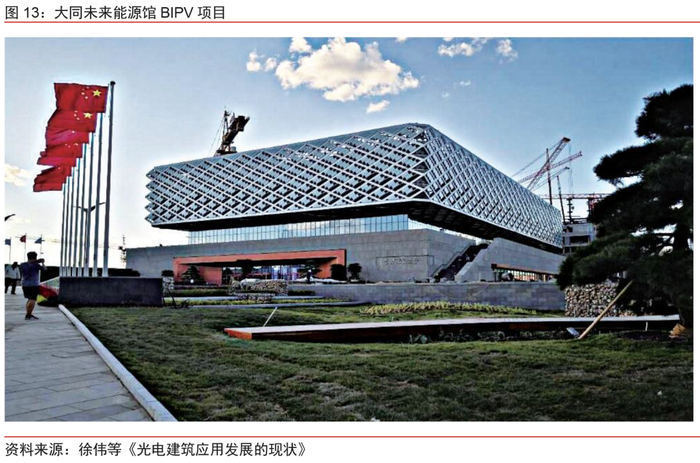 示范性建筑走在应用前列,在设计方主导下偏好薄膜产品。示范性光电/节能建筑或地标性公共建筑,对产品外观及品质有较高要求,而对成本相对不敏感,因而基于薄膜组件的光伏幕墙产品较为多见。同时,此类项目多选择资质、实力较强的设计和施工团队,对前沿产品/技术的接触度较高,具备系统设计能力,保证施工安装质量。此类BIPV项目中,设计方一般占据核心地位,从规划阶段起考虑系统方案,到设计阶段的选型定量,以及建设阶段产品的选择,都掌握较大话语权。以大同未来能源馆BIPV项目为例,北京建工集团作为其所在园区的EPC总承包单位,全面负责工程设计、建设及建成后运营管理。未来能源馆的光伏方案由北京建工集团能源团队打造,设计对标国内一流、世界领先,光伏材料选择体现前沿性和探索性的薄膜产品,施工团队则负责解决施工难度大精度要求高的问题。