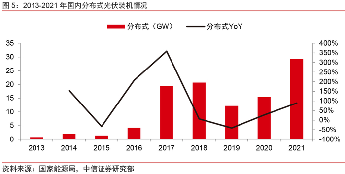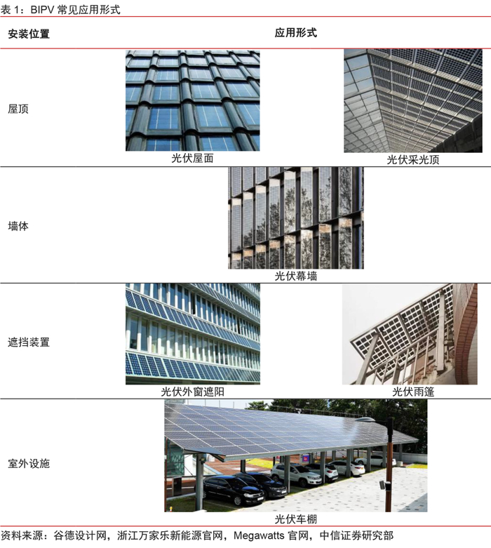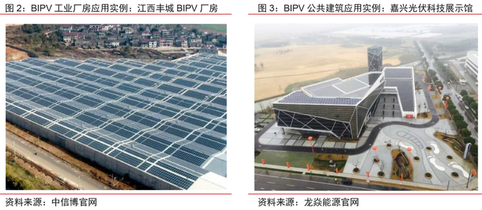 高度一体化,BIPV解锁光伏建筑应用新场景。光伏建筑一体化(Building Integrated Photovoltaic, BIPV)是分布式光伏发电系统的一种应用形式,实现了光伏发电产品和建筑的有机结合,兼具发电功能和建材属性,针对传统屋顶加装的光伏系统存在的一系列问题提供了解决方案。从国内市场来看,工业厂房、商业建筑、公共建筑屋顶和外立墙面可安装面积大,在晶硅组件成本不断下降、效率持续提升的情况下,已初具经济性,成为BIPV最具潜力和可行性的应用场景。
