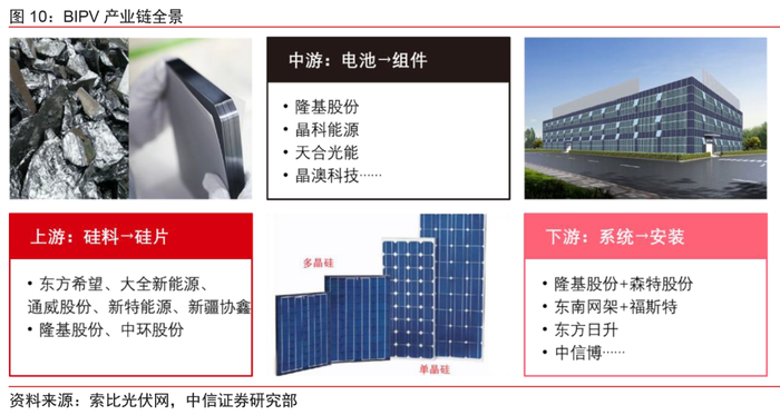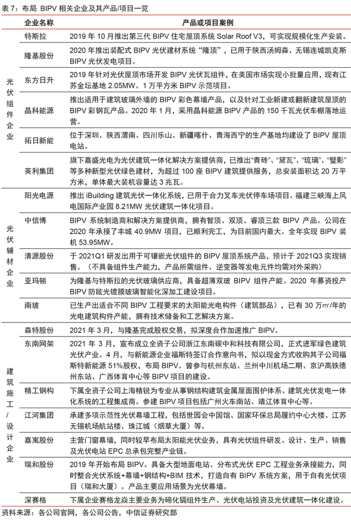 多环节共谋发展,龙头抢占先发优势。从已有项目经验来看,BIPV各环节玩家均有望开拓市场突破口,其中推进速度较快的是组件企业和建筑建材企业。同时,基于BIPV“光伏+建筑”的双重属性,光伏企业与建筑企业联合发展的模式应运而生,通过强强联合,先发领跑优势明显。BIPV相较于常规光伏系统有更多样化的组件产品,更好的封装材料,更薄的玻璃,低压电流的解决方案等;光伏产品和建筑结合的部分需要更坚固的结构件,更好的防水材料等。BIPV行业的发展将给产业链带来明显的变化。