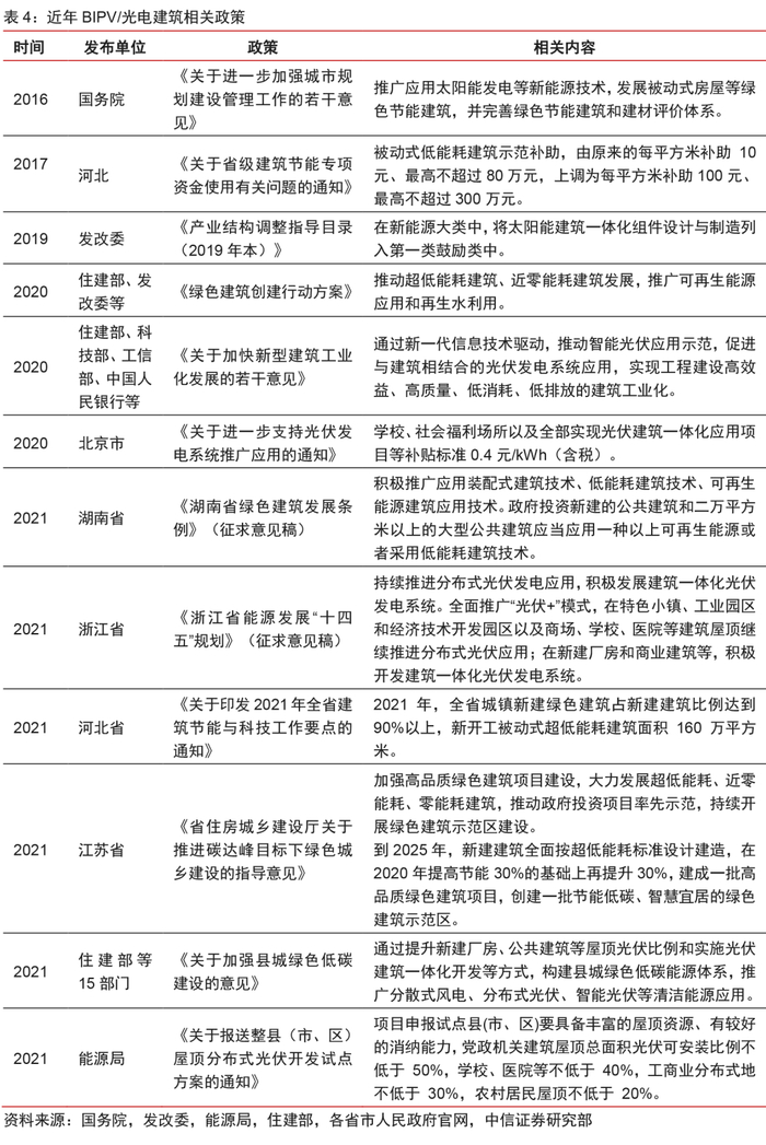 节能建筑政策持续支持,“十四五”期间BIPV有望加速铺开。尽管国家层面对工商业分布式光伏的度电补贴已经取消,但BIPV项目仍受到国家及地方政府对于绿色建筑的政策优待。2019年国家发改委印发了《绿色生活创建行动总体方案》,将绿色建筑行动列入创建内容之一。2020年住建部等7部门印发《绿色建筑创建行动方案》,提出推动超低能耗建筑、近零能耗建筑发展,推广可再生能源应用。此后各省市针对超低能耗建筑示范推广的政策陆续出台,在财政补贴、非计容面积奖励、备案价上浮、绿色信贷等方面提出了政策优惠。