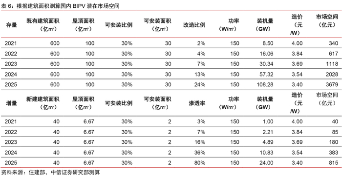 基于建筑面积的测算表明,“十四五”末BIPV潜在增量/存量市场规模或可达百亿/千亿元级别。截至2019年底,国内光电建筑应用面积约占既有建筑的1%;2020年主要企业BIPV安装总面积为0.04亿㎡,约占竣工建筑可安装面积的1.5%。国家能源局发布的《太阳能发展“十三五”规划》提出了“到2020年建成100个分布式光伏应用示范区,园区内80%的新建建筑屋顶、50%的已有建筑屋顶安装光伏发电”的目标。若保守估计,假设“十四五”仍延续这一发展目标,以此为BIPV未来渗透率增长测算依据,存量建筑改造比例和新增建筑安装比例均按指数式增长,预计2021-25E存量建筑年改造比例为2/4/7/13/24%,新增建筑安装比例为3/7/16/36/80%。根据国家统计局发布的数据,我国既有建筑总面积600亿㎡,近年年竣工面积约40亿㎡,按建筑物平均层数6层,屋面可安装比例30%(考虑机房、消防等附属设施占地)计算,考虑BIPV系统价格年均4%的降幅,预计到2025年存量/增量潜在市场规模可达3679/815亿元。
