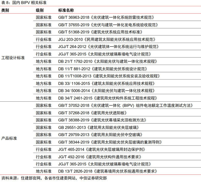 标准体系日臻完善,项目开展有据可依。目前,国内与BIPV相关的标准主要包括国家、行业和地方标准。根据标准的适用范围不同,主要分为工程标准和产品标准两类。从标准的发布进程来看,2018年以前只有部分地区有地方标准可以参考,近两年国家标准与行业标准逐渐丰富,体系逐渐完善;从标准的类型来看,现有的国家/行业标准侧重于建筑用光伏组件/光伏发电系统等产品,关于工程设计的相关标准较少;从标准的内容来看,光电建筑中电气、结构、保温等内容已有覆盖,但缺少防火等安全性能的指标与测试方法。2020年10月,中国光伏行业协会标准化技术委员会BIPV标准工作组正式成立,加快了针对BIPV的国家标准体系的建设,已有《民用建筑光伏架空隔热屋顶应用技术规范》和《金属屋面光伏建筑一体(BIPV)产品抗风揭试验方法》两部新规范的起草被提上日程。未来将逐步形成以国家标准为主,其他行业标准和地方标准相配合的体系,为BIPV的产品应用与工程设计保驾护航。