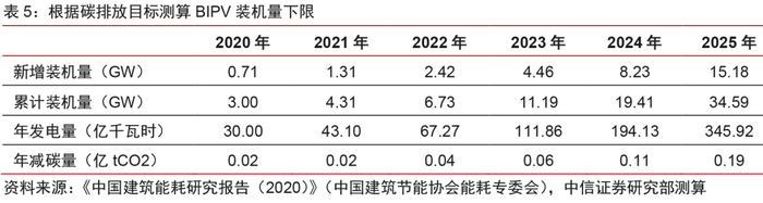 建筑行业减碳压力倒逼下,BIPV将迎爆发式增长。根据《中国建筑能耗研究报告(2020)》,碳达峰目标下,“十四五”期末建筑碳排放总量应控制在25亿tCO2,年均增速需要控制在1.50%,该目标对应至建筑产能场景,其中建筑产能增强对减碳量的贡献为36%,即到“十四五”末建筑产能环节的碳排量应控制在0.19亿吨。根据测算,光伏发电的碳排放强度为33-50g/kWh,而2018年我国全部发电方式的二氧化碳平均排放强度约592g/kWh。按光伏发电减碳550g/kWh,BIPV平均年利用时长1000小时计算,到2025年BIPV累计装机量至少应为34.6GW。若不考虑已有屋顶的改造,我们预计“十四五”期间年新增装机量CAGR达85%。