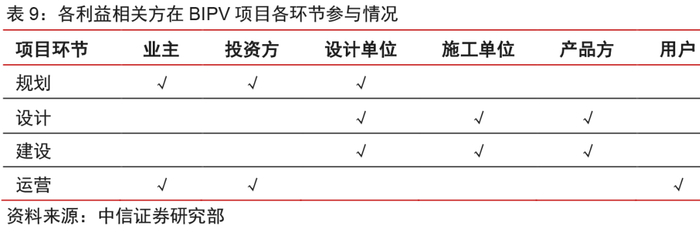 项目各环节均可能成为产品推广突破口。从建成项目的经验不难看出,每个项目至少存在某一利益相关方具备对BIPV的认知与理解,成为促成BIPV方案实现的主导者。BIPV要想实现规模化推广,一方面必须凭借经济效益上的竞争力打动业主或投资方,另一方面则需要破除建筑行业对产品的疑虑,打通建筑设计与施工环节,也是获得新的市场突破口的有效途径。