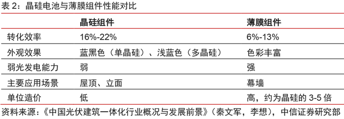 晶硅电池成本、发电效率优势显著,为现阶段BIPV组件最具性价比之选。BIPV主要采用的光伏技术可分为晶硅光伏组件和薄膜光伏组件。晶硅组件是目前光伏市场的主流产品,单位装机功率高,转化效率可达16%-22%,同样装机面积下发电量优于薄膜组件,但由于工艺原因,其色彩一致性较差。薄膜太阳能电池色彩丰富、整体感强,可满足各种建筑外观需求,但其较低的转化效率和3-5倍于晶硅电池的价格对大规模推广应用造成极大制约。