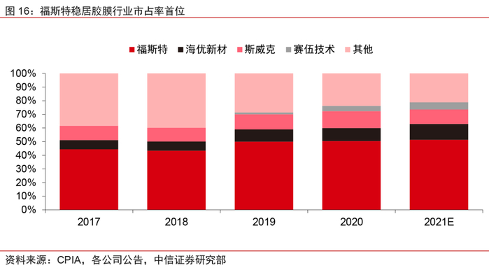 福斯特:光伏胶膜寡头地位稳固,着眼布局BIPV封装材料。福斯特公司主导产品为光伏封装材料(EVA/POE胶膜),贡献总收入的九成以上。光伏胶膜收入快速增长带动下,公司营业总收入稳步提升,毛利率保持在20%以上。封装胶膜是光伏产业链里集中度最高的环节,而福斯特作为全球光伏胶膜龙头,长期保持50%左右的市场份额,与众多知名光伏企业建立了深层次合作关系。公司2019年起开始研发BIPV用光伏新材料产品,先于行业其他竞争者开始相关布局,有望奠定新赛道中的先发优势。