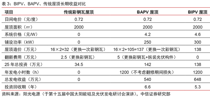 采用晶硅组件的BIPV屋顶具有投资效益上的相对优势。从屋面材料造价来看,由于BIPV一体化设计施工的特点,相较于BAPV能够节省传统屋面板材料与屋面加固的相关费用。从中长期来看,BIPV作为建材的耐候性使其能够获得更长的使用寿命,节省维护翻修费用,同时考虑运行期间的发电效益,在全寿命周期维度上获得更加可观的经济效益。