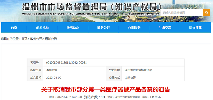 中国质量新闻网讯 2022年4月2日,浙江省温州市市场监督管理局网站发布关于取消该市部分第一类医疗器械产品备案的通告。