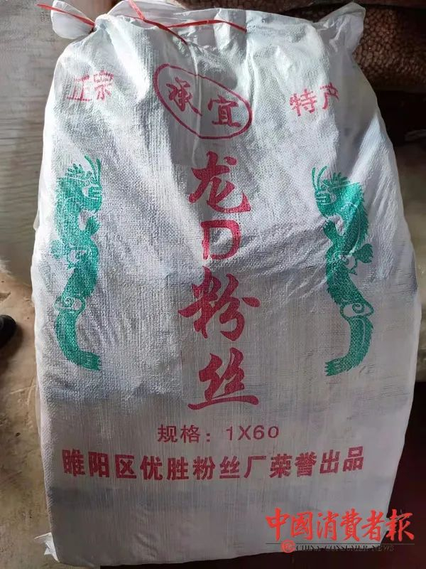 记者看到,每件“龙刃粉丝”都用一个蛇皮袋装着,上面写有“正宗 承宜 特产 龙刃粉丝 规格:1x60 睢阳区优胜粉丝厂荣誉出品”字样。每小包背面标签则写有“品名:龙刃粉丝;配料:绿豆淀粉、小麦淀粉、生活饮用水、食用盐;制造商:商丘市睢阳区优胜粉丝厂,地址:商丘市睢阳区路河镇李汉楼村蔡庄”字样。上述“ 龙刃粉丝”字体字形均仿冒“龙口粉丝”字体字形。