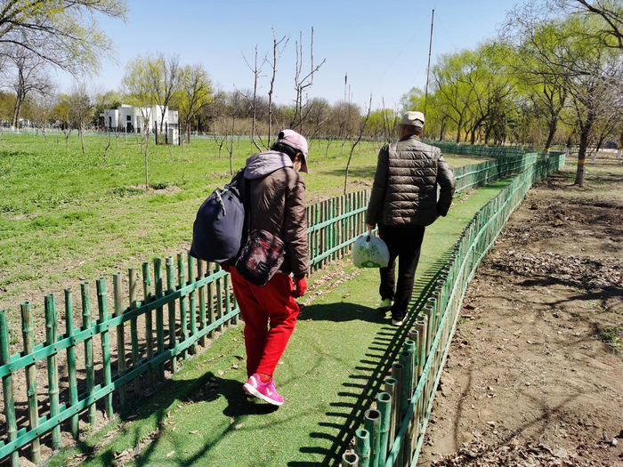 4月2日,京城梨园,两位市民正提着装有野菜的塑料袋沿途寻找下一个“目标”。实习生 张晓悦 摄