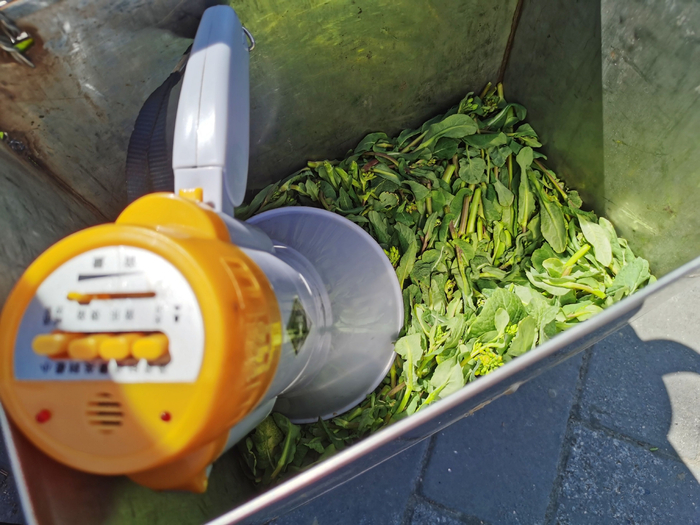 4月2日,京城梨园,保安巡逻人员的电动车后座旁安装了一个铁皮筐,装有没收的野菜。实习生 张晓悦 摄