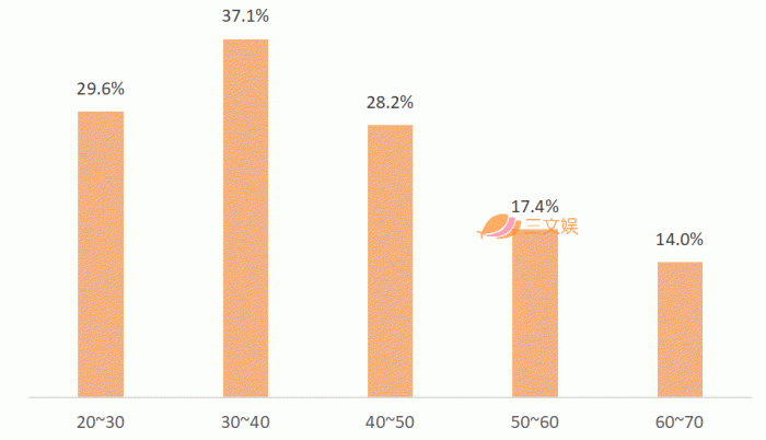 其中尤以30~40岁的用户最多,占比高达37.1%。其次是20~30岁29.6%,40~50岁28.2%,50~60岁17.4%,60~70岁14%。